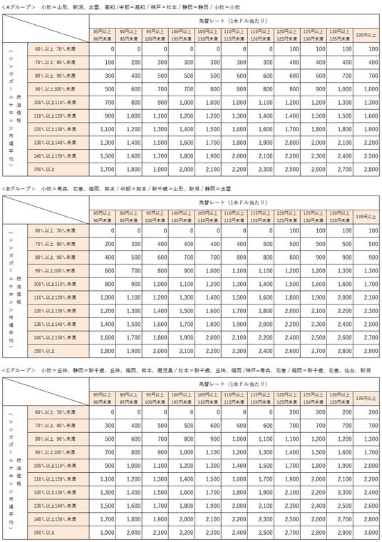 なお、燃油特別付加運賃は、シンガポールケロシン市況価格および為替レートの変動に応じて、 1ヶ月毎に見直しております。