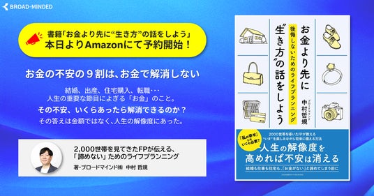 ライフプラン実現を支援する金融サービスを開発・提供するブロードマインド株式会社(本社:東京都渋谷区、代表取締役社長:伊藤清)で2,000世帯以上のコンサルティング実績を持つFP(ファイナンシャルプランナー)・中村哲規が、当社として初の書籍『お金より先に"生き方"の話をしよう~後悔しないためのライフプランニング~』(クロスメディア・パブリッシング)を発売します。