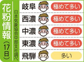 岐阜県内の花粉情報(17日) 2026年3月17日 09:00 岐阜県内の花粉飛散度は、以下の通り... 残り133文字(全文:150文字) この記事をお読みいただくには「デジタルプラン」または「宅配+デジタルプラン」の会員登録が必要です。無料会員の方はログインしてマイページからコース変更してください。デジタルプランまたは宅配+デジタルプランをご登録中の方はログインしてください。 岐阜新聞デジタル会員に登録すると 無料会員向け記事が読める ニュースレターで最新情報が受け取れる デジタルプラン、宅配+デジタルプランなら Webオリジナルコンテンツが読める 紙面ビューアが読める チケットの先行発売に参加できる お得なクーポンが使える 新規登録ページ ログインページ トップ 岐阜のニュース 岐阜県内の花粉情報(17日) 関連記事 岐阜県内・春の人事異動2026【県職員、教職員、市町村職員、県警など】 下呂市人事(4月1日) 金華山で登山の女性が転落、死亡 真桑文楽、情感豊かに 本巣市で奉納上演 岐阜市で桜開花、観測史上最も早い記録に並ぶ 高知、甲府でも開花 高山市の中心部、酒たる載せたみこし練る 新酒の完成祝う雫宮祭 おすすめ記事 公認会計士、県岐阜商高3年の渡邉さんが合格 短答式は計3人突破 市町村防災会議の男女比率、岐阜県は43位 「女性ゼロ」も7市町村 割合が低い理由は? 365日急患受け入れ体制整う 東濃中部医療センター、開院1カ月半 塚本院長に今後の展望聞く 岐阜護国神社の鵜飼桜、一気に満開