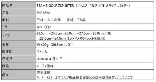 ブリヂストンスポーツ株式会社は、幅広いラインアップを取り揃えファッション感度の高いゴルファーに好まれている「BEAMS GOLF」がプロデュースした、スパイクレスシューズ『BEAMS GOLF ZSP-BITER』を4月9日に発売します。価格はオープンです。