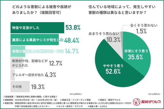 駆除ザウルス(運営:AAA ALLIANCE、所在地:東京都世田谷区、代表取締役:西岡 徹也)は、過去3年以内に自宅が害獣による被害に遭った経験のある20~70代の戸建て住宅居住者を対象に「害獣発生時期と害獣の種類」に関する調査を行いました。