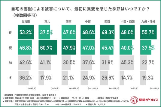 「自宅の害獣による被害について、最初に異変を感じた季節」について尋ねたところ、以下のような回答になりました。