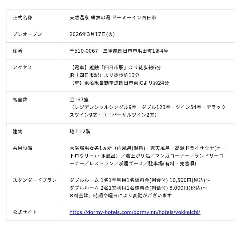 平素よりドーミーインならびに御宿 野乃をご愛顧いただき、誠にありがとうございます。このたび、三重県内2棟目となる「ドーミーイン四日市」が3月17日(火)にプレオープンいたしました。当ホテルでは男女ともに天然温泉大浴場に加え、高温ドライサウナを完備。心地よい熱気と蒸気に包まれ、日々の疲れをリフレッシュしていただける空間となっております。また、ドーミーインの醍醐味の一つであるご朝食には、三重の味覚をふんだんに取り入れています。名物の「四日市とんてき」や「松阪牛コロッケ」など、地元の食文化を存分に堪能できるラインナップで皆様の活力ある一日をサポートいたします。そして今回のオープンは、ドーミーインチェーンにおいて国内100棟目を迎える記念すべき節目となります。この大きな節目にふさわしいおもてなしでお客様をお迎えし、何度でも足を運びたくなるような「我が家の寛ぎ」を目指してまいります。スタッフ一同、皆様のお越しを心よりお待ち申し上げております。