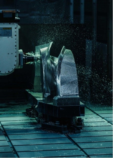 コイルケース試作品の加工風景。硬度の高い素材を、五軸加工機で慎重に削り出していく。