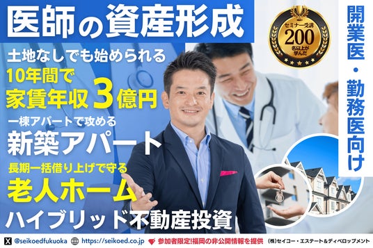 九州・福岡を拠点に、不動産投資家向け新築アパート一棟投資と老人ホーム投資を支援する株式会社セイコー・エステート&ディベロップメント(本社:福岡市博多区、代表取締役:高木政利)は、医師(開業医・勤務医)などの高所得層に特化した「医師のための長期一括借上げの安定収益を生む老人ホーム不動産投資セミナー。攻めの新築アパート×守りの老人ホーム。拡大と安定のハイブリッド型不動産投資セミナー」を2026年3月28日(土)に開催いたします。(オンラインZOOM/福岡本社の同時開催)本セミナーでは、2024年から本格化した「医師の働き方改革」による時間外労働規制に伴う将来的な減収不安や、高止まりする所得税負担を解決する手段として、「守りの老人ホーム投資」と「攻めの新築アパート投資」を組み合わせた独自のスキーム、利回りの考え方などを代表の高木政利が徹底解説します。1年で家賃収入3,000万円・10年で3億円を目指せる資産形成のロードマップを公開し、土地を持たない会社員や医師、経営者でも参入できる現実的な手法を解説します。