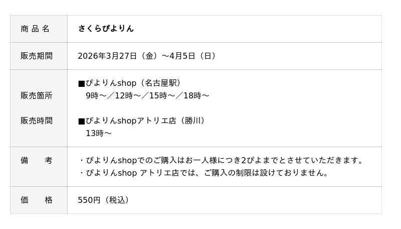 ジェイアール東海フードサービス株式会社(本社:愛知県名古屋市、代表取締役社長:岩下賢一)は、人気スイーツ「ぴよりん」の限定商品「さくらぴよりん」を、2026年3月27日(金)から4月5日(日)までの期間限定で販売いたします。桜の季節を彩る定番として人気の「さくらぴよりん」、そのかわいらしい見た目とふんわりとしたさくらの風味が口いっぱいに広がる味わいで、毎年多くのファンを魅了するこの時期ならではのぴよりんをぜひお楽しみください。