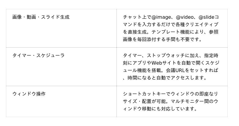 テキスト処理だけでなく、画像・動画・スライド生成、タイマーやランチャー機能まで、これひとつに凝縮。あなたの作業の「フロー」を途切れさせません。