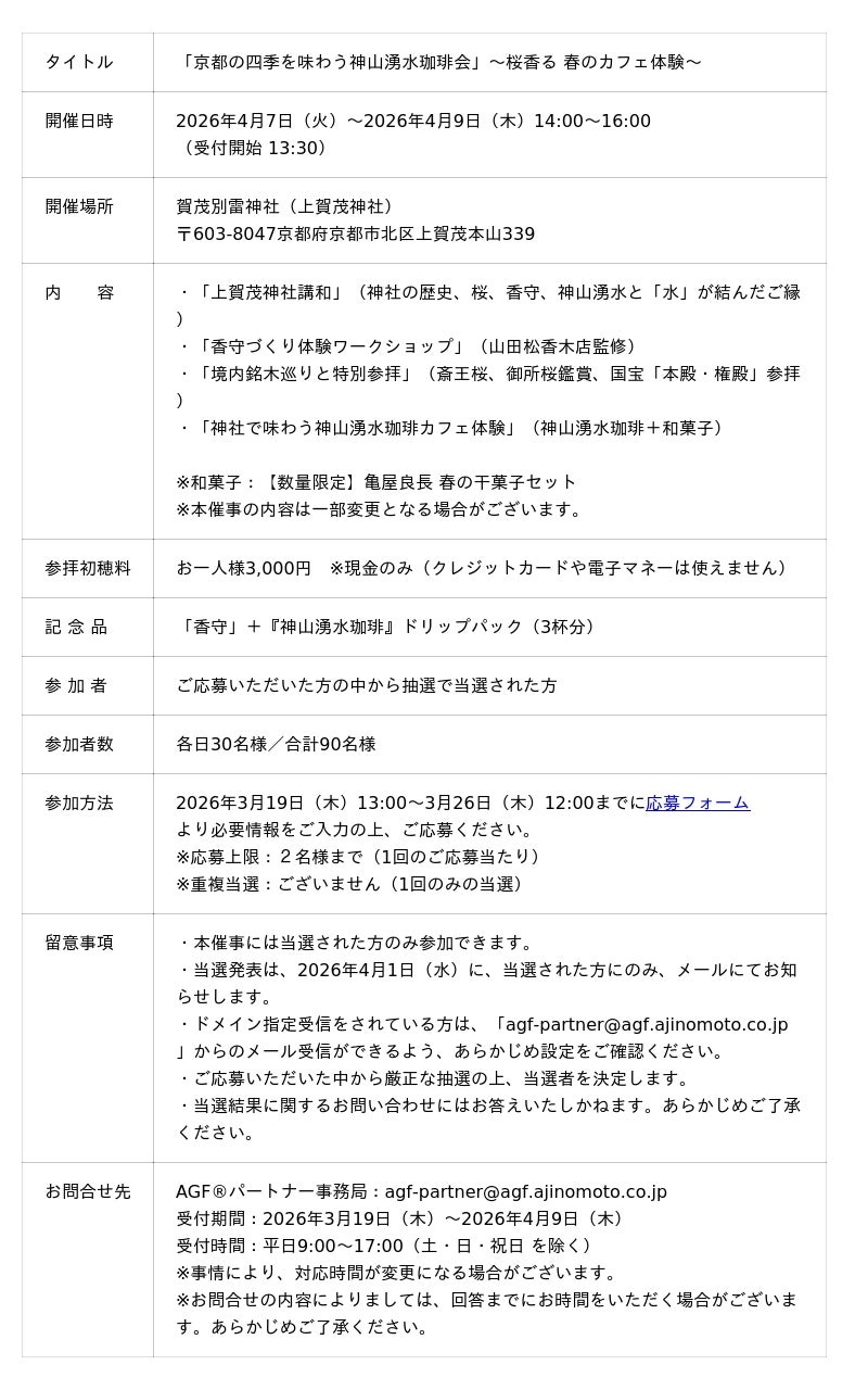 「ココロとカラダの健康」への貢献を目指す味の素AGF株式会社(代表取締役社⾧:島本 憲仁 以下、味の素AGF)と、京都の名水「神山湧水」を守り続けてきた賀茂別雷神社(通称:上賀茂神社)は、『神山湧水珈琲』ドリップパック奉納25万杯突破を記念して、2026年4月7日(火)から4月9日(木)の期間限定で、境内の桜銘木巡り特別参拝や香守づくり体験ワークショップ、『神山湧水珈琲』を堪能できる、「京都の四季を味わう神山湧水珈琲会」~桜香る 春のカフェ体験~を開催します。