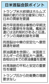 ホルムズ海峡「貢献を」 トランプ氏、日本に要請 日米首脳会談 首相「艦船派遣に制約」 2026年3月21日 05:00 ホワイトハウスで行われた夕食会で、あいさつするトランプ米大統領(右)を見る高市首相=19日、ワシントン(共同) 【ワシントン共同=西山晃平】高市... 残り1084文字(全文:1101文字) この記事をお読みいただくには「デジタルプラン」または「宅配+デジタルプラン」の会員登録が必要です。無料会員の方はログインしてマイページからコース変更してください。デジタルプランまたは宅配+デジタルプランをご登録中の方はログインしてください。 岐阜新聞デジタル会員に登録すると 無料会員向け記事が読める ニュースレターで最新情報が受け取れる デジタルプラン、宅配+デジタルプランなら Webオリジナルコンテンツが読める 紙面ビューアが読める チケットの先行発売に参加できる お得なクーポンが使える 新規登録ページ ログインページ トップ 岐阜のニュース ホルムズ海峡「貢献を」 トランプ氏、日本に要請 日米首脳会談 首相「艦船派遣に制約」 関連記事 ご当地ボンゴレパスタ登場 安八町の浅野撚糸本社併設カフェ新メニュー ゴルフ 西郷7位発進 米女子第1R ★久常と平田、47位スタート ゴルフ Vポイント女子 佐久間2位発進 朴首位 きょうのスポーツ 大相撲春場所13日目 霧島賜杯王手 琴勝峰、豊昇龍に敗れ3敗目 おすすめ記事 長良川遊覧船、日常変える45分 岐阜市で運航スタート 書店「丸善」創業者・早矢仕有的の軌跡、ハヤシライスも実は…山県市出身、マーサで資料展開幕 ご当地ボンゴレパスタ登場 安八町の浅野撚糸本社併設カフェ新メニュー 上杉謙信の愛刀「三日月兼光」優美な品格 名古屋で刀剣特別展が開幕