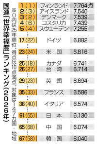 日本 幸福度61位 国連など、SNS過剰使用指摘 2026年3月21日 05:00 国連「世界幸福度」 ランキング(2026年) 【ロンドン共同】国連や英オックス... 残り440文字(全文:457文字) この記事をお読みいただくには「デジタルプラン」または「宅配+デジタルプラン」の会員登録が必要です。無料会員の方はログインしてマイページからコース変更してください。デジタルプランまたは宅配+デジタルプランをご登録中の方はログインしてください。 岐阜新聞デジタル会員に登録すると 無料会員向け記事が読める ニュースレターで最新情報が受け取れる デジタルプラン、宅配+デジタルプランなら Webオリジナルコンテンツが読める 紙面ビューアが読める チケットの先行発売に参加できる お得なクーポンが使える 新規登録ページ ログインページ トップ 岐阜のニュース 日本 幸福度61位 国連など、SNS過剰使用指摘 関連記事 ご当地ボンゴレパスタ登場 安八町の浅野撚糸本社併設カフェ新メニュー ゴルフ 西郷7位発進 米女子第1R ★久常と平田、47位スタート ゴルフ Vポイント女子 佐久間2位発進 朴首位 きょうのスポーツ 大相撲春場所13日目 霧島賜杯王手 琴勝峰、豊昇龍に敗れ3敗目 おすすめ記事 長良川遊覧船、日常変える45分 岐阜市で運航スタート 書店「丸善」創業者・早矢仕有的の軌跡、ハヤシライスも実は…山県市出身、マーサで資料展開幕 ご当地ボンゴレパスタ登場 安八町の浅野撚糸本社併設カフェ新メニュー 上杉謙信の愛刀「三日月兼光」優美な品格 名古屋で刀剣特別展が開幕