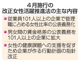 改正女性活躍推進法が4月に施行され、管理職に占める女性比率の公表が従業員101人以上の企業の義務となる。義務化は初めて。男女間の賃金格差の公表義務は対象が現行の301人以上から101人以上に広がる。女性の登用や賃金差を透明化し、格差是正につなげる狙いがある。女性の管理職比率や賃金差の情報は、女性が就職先を選ぶ際の判断材料になりそうだ。
