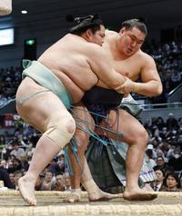 安青錦(右)を攻める霧島。2敗目を喫したが、3敗で追っていた力士が敗れ優勝が決まった=エディオンアリーナ大阪