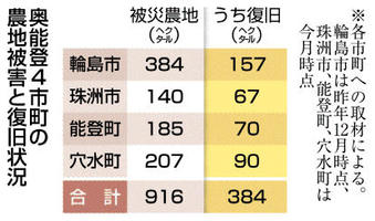 能登4市町 農地復旧4割 豪雨1年半 二重被災影響続く 2026年3月22日 05:00 2024年元日の能登半島地震と同... 残り752文字(全文:769文字) この記事をお読みいただくには「デジタルプラン」または「宅配+デジタルプラン」の会員登録が必要です。無料会員の方はログインしてマイページからコース変更してください。デジタルプランまたは宅配+デジタルプランをご登録中の方はログインしてください。 岐阜新聞デジタル会員に登録すると 無料会員向け記事が読める ニュースレターで最新情報が受け取れる デジタルプラン、宅配+デジタルプランなら Webオリジナルコンテンツが読める 紙面ビューアが読める チケットの先行発売に参加できる お得なクーポンが使える 新規登録ページ ログインページ トップ 岐阜のニュース 能登4市町 農地復旧4割 豪雨1年半 二重被災影響続く 関連記事 BTSが復帰公演 ソウル 7人全員「完全体」 燃料高暮らし「限界」 県内ひとり親世帯 送迎や通勤、出費増/食料配布減 訃報 大塚将司さん 雌の“最重量級”ダブリュが優勝 大分・高崎山サル総選挙 俳優のチャック・ノリスさん死去 「ドラゴンへの道」 海に転落3人不明 釣り中 実習生、1人死亡 福井 おすすめ記事 岐阜県庁から舞台の地を一望 大河ドラマ「豊臣兄弟!」仲野太賀さんと白石聖さんがトークショー 淡墨桜や荘川桜、岐阜県を代表する桜ライトアップ JR岐阜駅北口 長良川遊覧船、日常変える45分 岐阜市で運航スタート 書店「丸善」創業者・早矢仕有的の軌跡、ハヤシライスも実は…山県市出身、マーサで資料展開幕