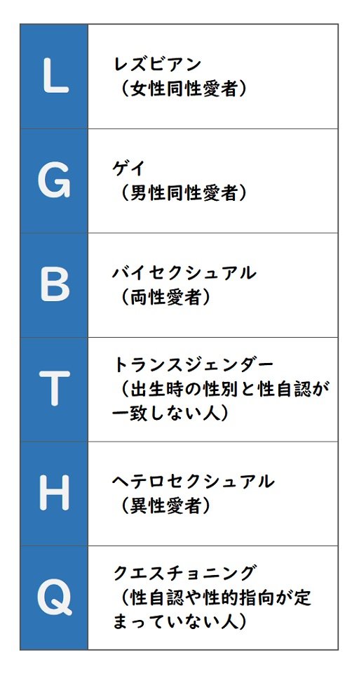 これに多数派であるH(ヘテロセクシュアル、異性愛者)とQ(クエスチョニング、性自認や性的指向が定まっていない人)を併せ、性の多様性を表します。