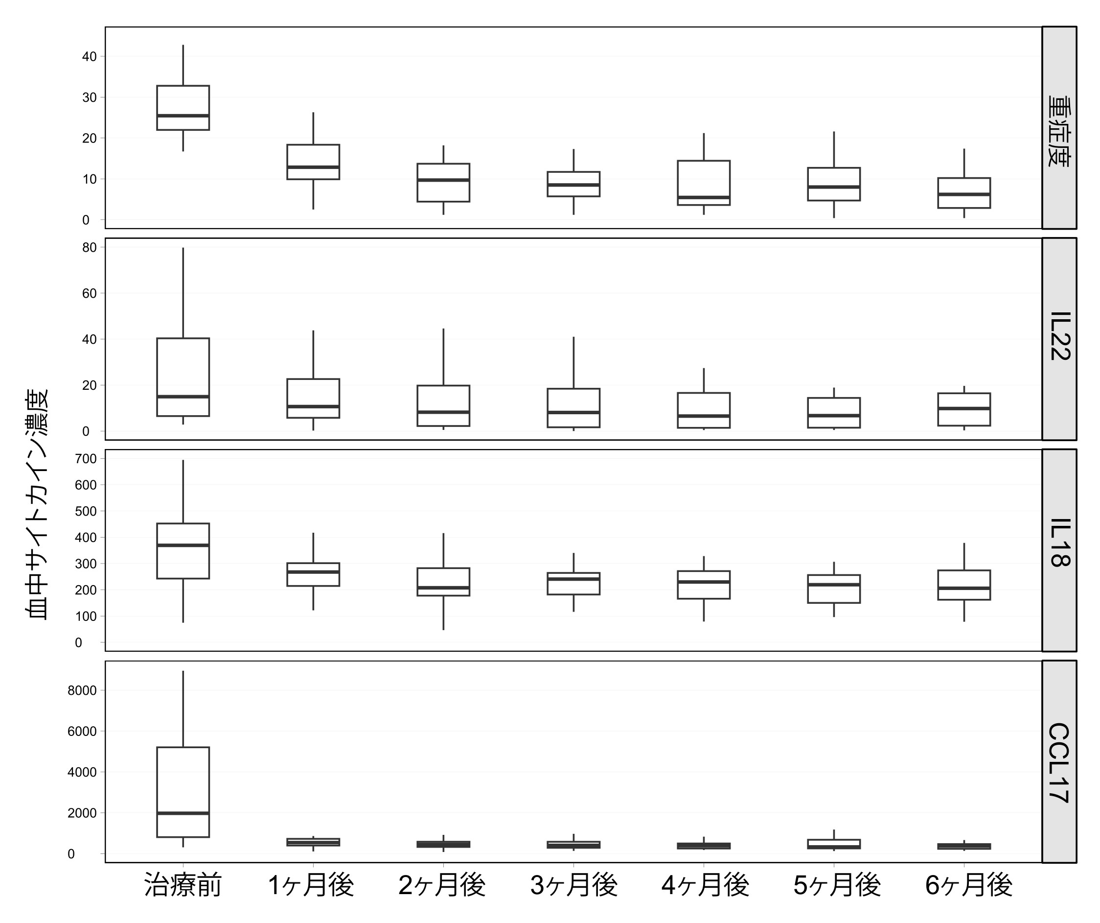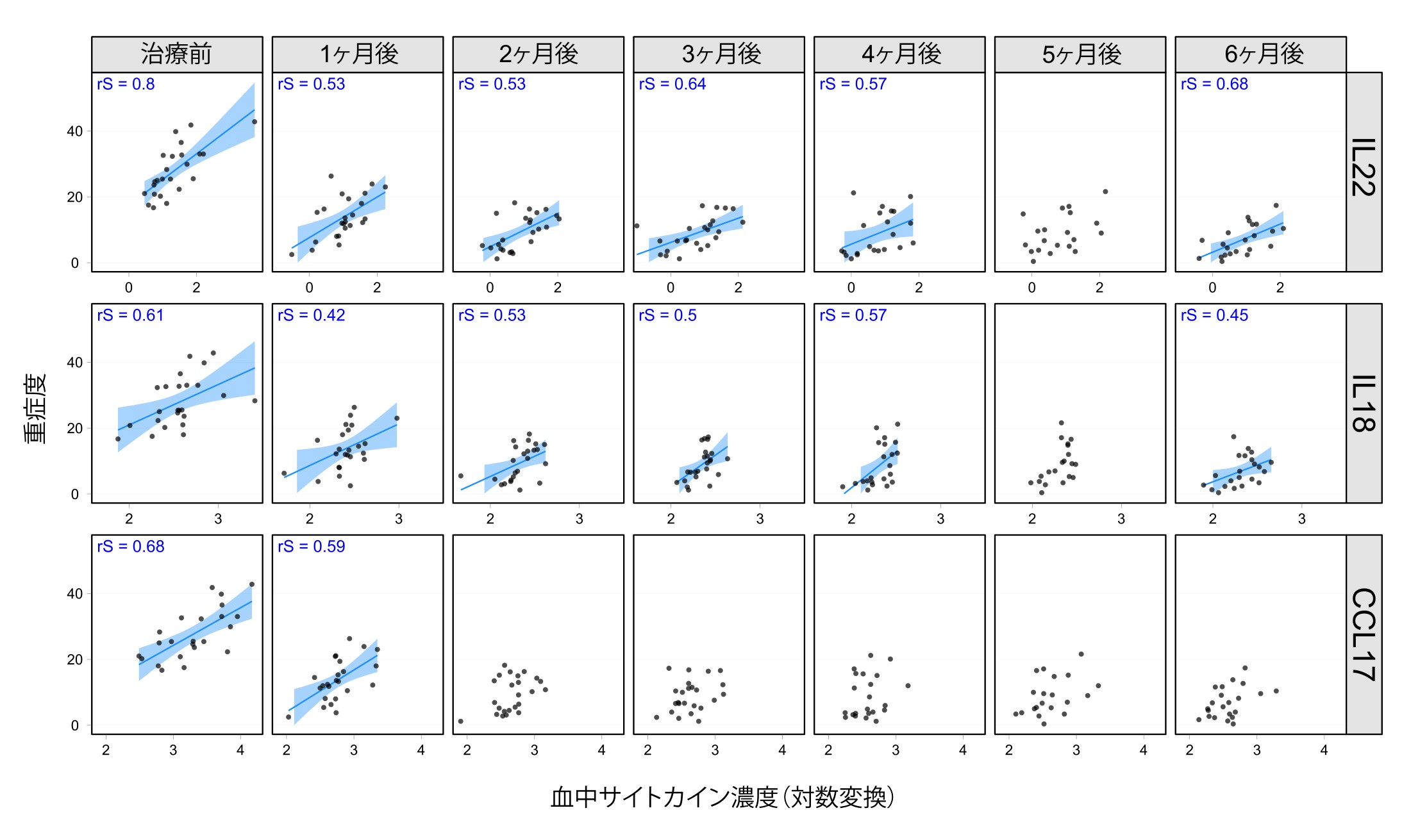 縦断解析(24名、6か月追跡)では、血中CCL17は治療開始後に速やかに低下し、その後は値が低い状態で推移しました。そのため、治療初期には重症度と相関がみられる一方で、治療継続中には重症度との関連が弱くなる傾向が示されました。