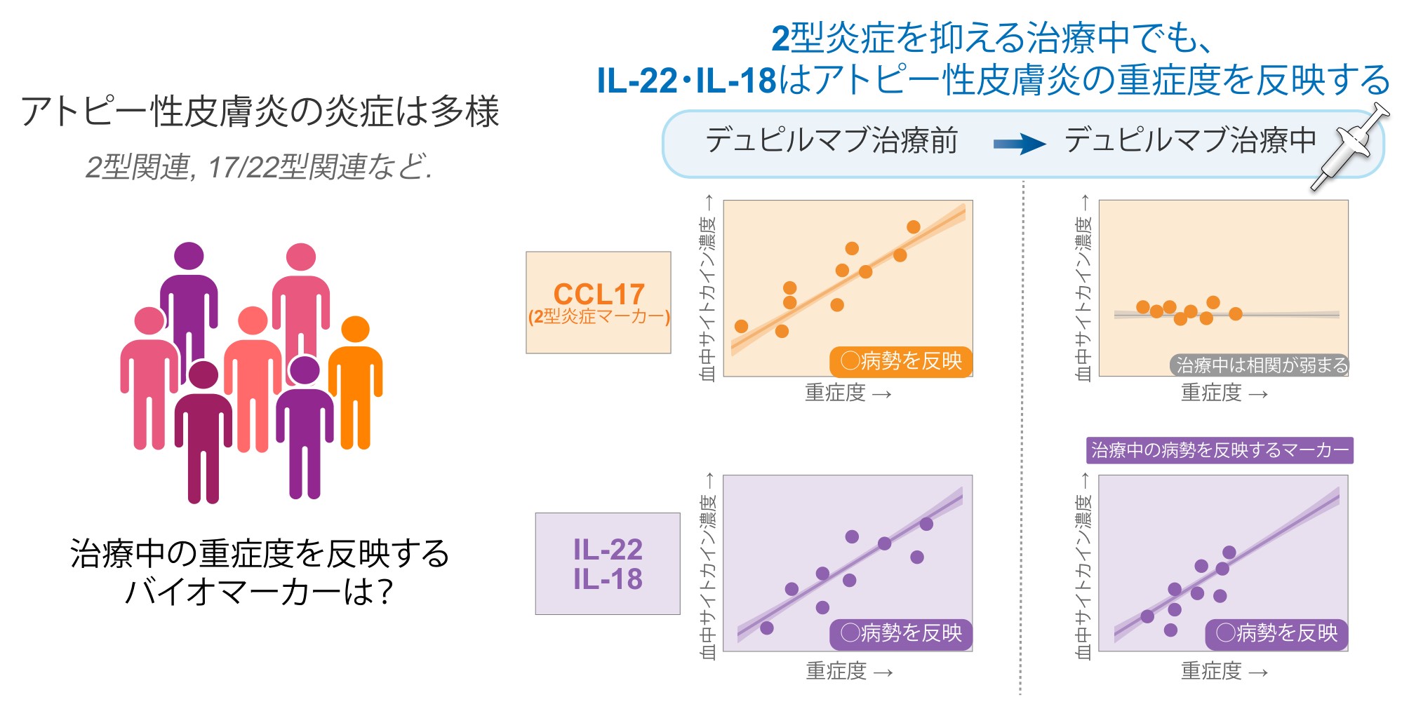 一方、IL-22およびIL-18は治療開始後に低下しつつも一定の変動幅を保ち、治療期間を通じて重症度と関連していました。これらの結果から、デュピルマブ治療下では、IL-22およびIL-18が治療中に残存する疾患活動性を捉える補完的バイオマーカーとなり得ることが示されました。