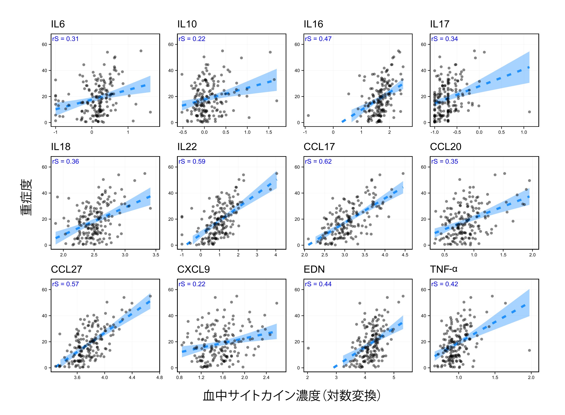 アトピー性皮膚炎患者170名の、血中サイトカイン濃度(log10変換)と重症度(EASI)の関連。CCL17、IL-22、IL-18を含む複数のサイトカインが重症度と関連を示し、血液検査による病勢評価の可能性が示された。※Spearmanの順位相関係数(rS)を図中に示す。