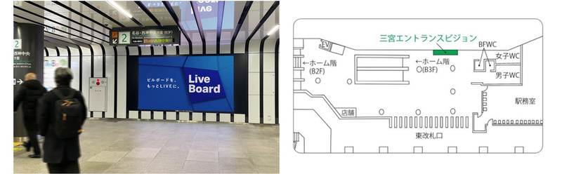 阪急阪神マーケティングソリューションズ株式会社(本社:大阪市北区 代表取締役社長 上田 均 以下、阪急阪神マーケティングソリューションズ)と株式会社 LIVE BOARD(本社:東京都渋谷区 代表取締役社長 田中 淳泰 以下、LIVE BOARD)は、阪急阪神マーケティングソリューションズが運用・管理する「三宮エントランスビジョン」、「三宮ホームDS-2」、「三宮コンコースDS」を、2026年4月6日(月)よりLIVE BOARDマーケットプレイス※1へ接続します。