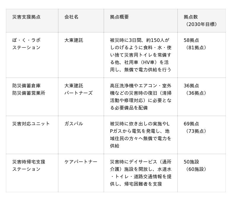 現在、全国213拠点※2に展開している災害支援拠点は、2030年度までに約2割増となる250拠点※3へと拡大します。大東建託の支店による物資備蓄と災害時の地域支援、大東建託パートナーズによる復旧資材の備蓄と早期復興支援、ガスパルのガスバルク等を活用した非常用電力の無償供給、そしてケアパートナーの施設による帰宅支援といったグループ各社の専門性を結集させることで、入居者様に限定せず地域住民の方々も広く支援できる体制を整えていきます。