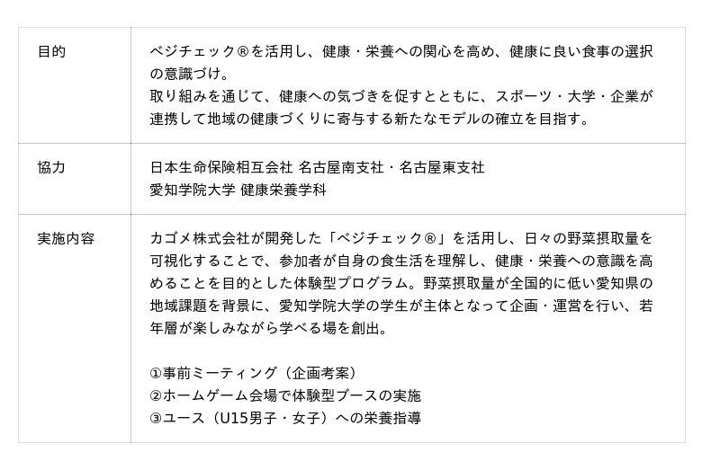 本取り組みは、これまで継続してきた栄養教育活動の集大成として実施したものです。ホームゲーム会場では、多くのファンの皆さまにべジチェックへご参加いただき、自身の野菜摂取状況を“見える化”する機会を提供してきました。今回は、その測定結果や傾向を活用し、クラブの次世代育成へと還元しました。