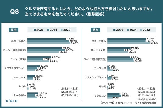 将来的にクルマを持つ場合、都内・地方ともに「現金一括購入」がトップ、都内ではサブスク検討度が増加傾向