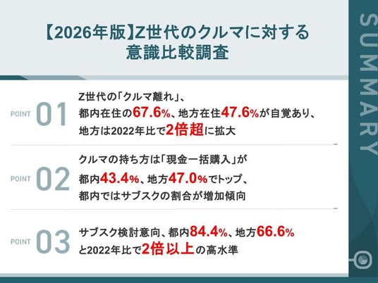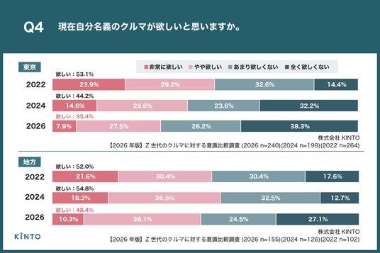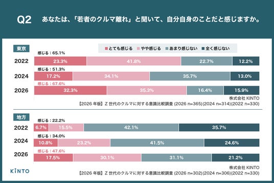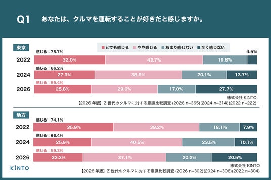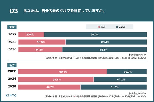 株式会社KINTO(本社:愛知県名古屋市、代表取締役社長:小寺 信也)は、普通自動車免許を持っている都内在住のZ世代(18歳~25歳)365名と普通自動車免許を持っている地方(政令指定都市がない県)在住のZ世代(18歳~25歳)302名 を対象に、【2026年版】Z世代のクルマに対する意識比較調査を実施しましたので、お知らせいたします。