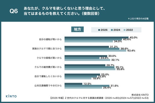 Q4で「現在、自分名義のクルマが欲しくない」と回答した方に、「Q6.あなたがクルマを欲しくないと思う理由として、当てはまるものを教えてください。(複数回答)」と質問したところ、▼都内在住は1位「公共交通機関で十分だから」40.0%、2位「自分の運転が怖いから」36.1%、3位「クルマの維持費が高いから」29.7%、▼地方在住は1位「自分の運転が怖いから」45.0%、2位「家族のクルマで間に合うから」31.2%、3位「クルマの価格が高いから」30.0%という結果になりました。