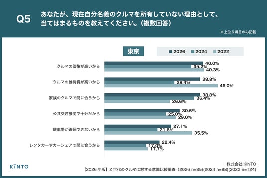 Q4で「現在、自分名義のクルマが欲しい」と回答した方に、「Q5. あなたが、現在自分名義のクルマを所有していない理由として、当てはまるものを教えてください。(複数回答)」と質問したところ、▼都内在住は1位「クルマの価格が高いから」40.0%、2位「クルマの維持費が高いから」38.8%、同率2位「家族のクルマで間に合うから」38.8%、▼地方在住は1位「家族のクルマで間に合うから」33.3%、2位「クルマの価格が高いから」30.7%、3位「クルマの維持費が高いから」24.0%という結果になりました。