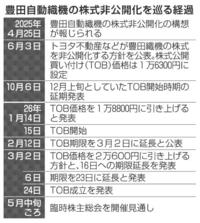 豊田織機TOB成立 トヨタG、5.9兆円買収 2026年3月25日 05:00 トヨタ自動車グループのトヨタ不動... 残り854文字(全文:871文字) この記事をお読みいただくには「デジタルプラン」または「宅配+デジタルプラン」の会員登録が必要です。無料会員の方はログインしてマイページからコース変更してください。デジタルプランまたは宅配+デジタルプランをご登録中の方はログインしてください。 岐阜新聞デジタル会員に登録すると 無料会員向け記事が読める ニュースレターで最新情報が受け取れる デジタルプラン、宅配+デジタルプランなら Webオリジナルコンテンツが読める 紙面ビューアが読める チケットの先行発売に参加できる お得なクーポンが使える 新規登録ページ ログインページ トップ 岐阜のニュース 豊田織機TOB成立 トヨタG、5.9兆円買収 関連記事 岐阜市でコンビニ強盗 刃物男「お金下さい」20万円奪い逃走 人工芝グラウンド完成 可児市運動公園、4日にスポーツマルシェ ぎふサテ! 午後4時59分~ 高次脳機能障害 理解の一歩に 支援法施行、県内の当事者が思い 事故後に診断、視界の半分認識できず 多治見署管内、特殊詐欺相次ぐ 3件、150~250万円被害 レターパック購入マネロン黙認疑い 元郵便局長ら書類送検 おすすめ記事 人工芝グラウンド完成 可児市運動公園、4日にスポーツマルシェ 岐阜市でコンビニ強盗 刃物男「お金下さい」20万円奪い逃走 岐阜県在住外国人、この10年で何が変わったのか データで分析 あなたの町で起きていること 岐阜の企業人として一歩踏み出す 県内各社で入社式