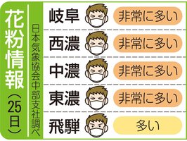 岐阜県内の花粉情報(25日) 2026年3月25日 09:44 岐阜県内の花粉飛散度は、以下の通り... 残り133文字(全文:150文字) この記事をお読みいただくには「デジタルプラン」または「宅配+デジタルプラン」の会員登録が必要です。無料会員の方はログインしてマイページからコース変更してください。デジタルプランまたは宅配+デジタルプランをご登録中の方はログインしてください。 岐阜新聞デジタル会員に登録すると 無料会員向け記事が読める ニュースレターで最新情報が受け取れる デジタルプラン、宅配+デジタルプランなら Webオリジナルコンテンツが読める 紙面ビューアが読める チケットの先行発売に参加できる お得なクーポンが使える 新規登録ページ ログインページ トップ 岐阜のニュース 岐阜県内の花粉情報(25日) 関連記事 岐阜県内の花粉情報(29日) 満開次々! 岐阜県内・桜の開花状況 一覧(3月28日夕 本社調べ) FC岐阜がホームで大勝 暫定1位に 百年構想リーグ 瑞穂市でアパート火災 50代男性死亡 チューリップ祭が開幕 海津市の木曽三川公園センター 早咲きの品種は見頃に アイドルのステージも 岐阜県内の花粉情報(28日) おすすめ記事 川本絶好調!圧巻ハットトリック FC岐阜5発大勝、百年構想リーグ暫定首位に 長良川鉄道の新車両「清流号」発車 長良川の夕闇表すウカイブルー 白川橋100年で虹色ライトアップ 白川町が光源リニューアル バレーボール・JAぎふ、プレーオフ決勝初進出 Vリーグ女子