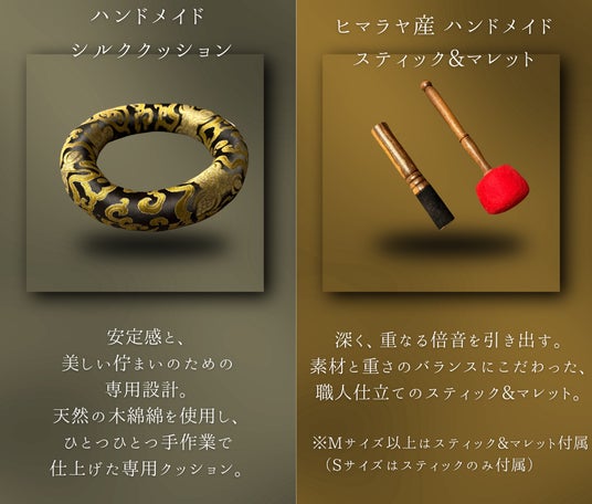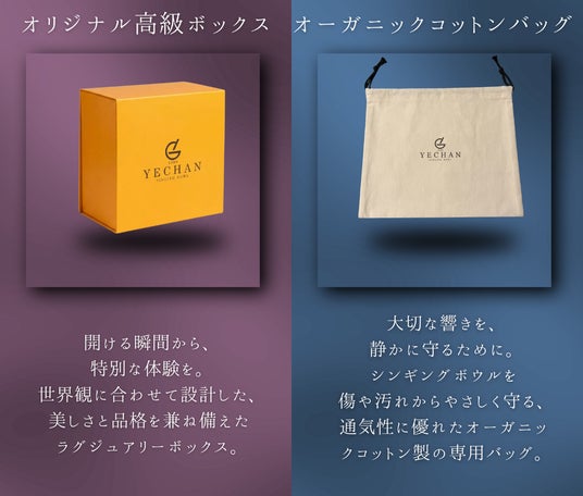 YECHAN 音浴シンギングボウルには、専用マレット、スティック、ハンドメイドシルククッション、オーガニックコットンバッグ、オリジナル高級ボックスなどが付属します。初めてシンギングボウルに触れる方でも、届いたその日からすぐに音を楽しめるよう、必要なものを一式そろえた構成です。