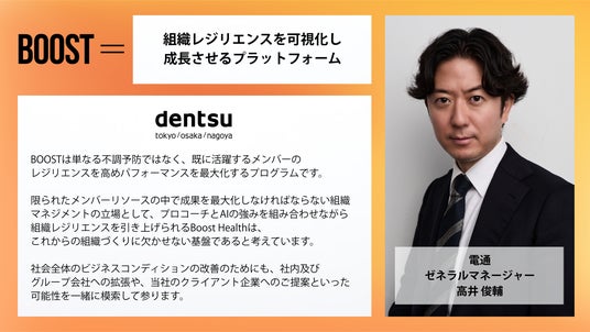 Boost Healthは、認知行動療法などの心理科学とAI技術を組み合わせた、企業向けタレントサクセスサービス「BOOST」を提供しています。社員一人ひとりが自律的に課題に対処し、持続的に成果を出し続けられる組織づくりを支援します。