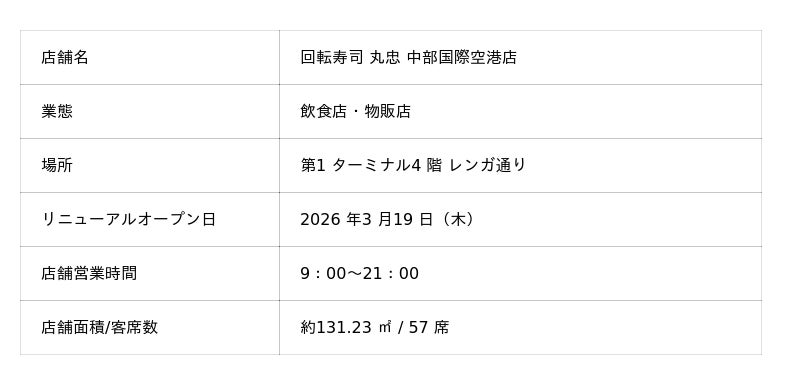 2026年3月19日(木)、中部国際空港にて「回転寿司 丸忠 中部国際空港店」がリニューアルオープン!エンターテインメント性をさらに強化し、五感でお寿司を楽しめる店舗へと生まれ変わりました。