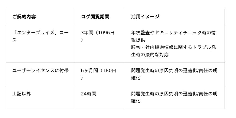 内部統制や監査対応が必要な企業様には、3年間のログ保存が可能な「エンタープライズ」コースを推奨いたします。