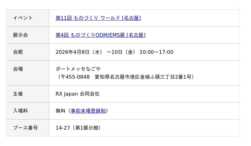 株式会社テクノア(本社:岐阜県岐阜市、代表取締役:山崎 耕治)は、4月8日~10日に ポートメッセなごや で開催される「第11回 ものづくり ワールド [名古屋]」に出展いたします。