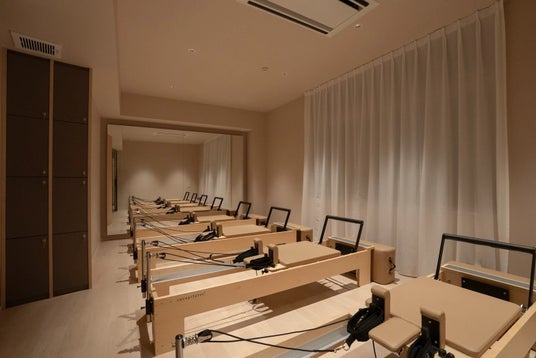 carepilatesのリフォーマーが並び統一感のある配置が、集中しやすい環境を演出。