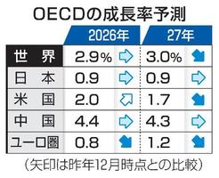【ブリュッセル共同】経済協力開発機構(OECD)は26日公表した最新の経済見通しで、2026年の世界全体の実質経済成長率を2・9%と予測し、昨年12月の前回予測から据え置いた。中東での紛争に伴うエネルギー価格上昇が経済を下押しし、トランプ関税の実質的な税率低下や活発な人工知能(AI)関連投資によるプラス効果を打ち消すと見込んだ。日本の成長率も前回予測と同じ0・9%とした。