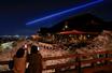 春の夜間特別拝観が始まるのを前に、試験点灯でライトアップされた京都市東山区の清水寺=26日夜