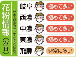 岐阜県内の花粉情報(27日) 2026年3月27日 09:08 岐阜県内の花粉飛散度は、以下の通り... 残り136文字(全文:153文字) この記事をお読みいただくには「デジタルプラン」または「宅配+デジタルプラン」の会員登録が必要です。無料会員の方はログインしてマイページからコース変更してください。デジタルプランまたは宅配+デジタルプランをご登録中の方はログインしてください。 岐阜新聞デジタル会員に登録すると 無料会員向け記事が読める ニュースレターで最新情報が受け取れる デジタルプラン、宅配+デジタルプランなら Webオリジナルコンテンツが読める 紙面ビューアが読める チケットの先行発売に参加できる お得なクーポンが使える 新規登録ページ ログインページ トップ 岐阜のニュース 岐阜県内の花粉情報(27日) 関連記事 岐阜県内の花粉情報(29日) 満開次々! 岐阜県内・桜の開花状況 一覧(3月28日夕 本社調べ) FC岐阜がホームで大勝 暫定1位に 百年構想リーグ 瑞穂市でアパート火災 50代男性死亡 チューリップ祭が開幕 海津市の木曽三川公園センター 早咲きの品種は見頃に アイドルのステージも 岐阜県内の花粉情報(28日) おすすめ記事 川本絶好調!圧巻ハットトリック FC岐阜5発大勝、百年構想リーグ暫定首位に 長良川鉄道の新車両「清流号」発車 長良川の夕闇表すウカイブルー 白川橋100年で虹色ライトアップ 白川町が光源リニューアル バレーボール・JAぎふ、プレーオフ決勝初進出 Vリーグ女子
