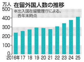 在留外国人400万人超え 25年末 最多更新、人口比3.3% 2026年3月28日 05:00 出入国在留管理庁は27日、202... 残り667文字(全文:684文字) この記事をお読みいただくには「デジタルプラン」または「宅配+デジタルプラン」の会員登録が必要です。無料会員の方はログインしてマイページからコース変更してください。デジタルプランまたは宅配+デジタルプランをご登録中の方はログインしてください。 岐阜新聞デジタル会員に登録すると 無料会員向け記事が読める ニュースレターで最新情報が受け取れる デジタルプラン、宅配+デジタルプランなら Webオリジナルコンテンツが読める 紙面ビューアが読める チケットの先行発売に参加できる お得なクーポンが使える 新規登録ページ ログインページ トップ 岐阜のニュース 在留外国人400万人超え 25年末 最多更新、人口比3.3% 関連記事 岐阜市商連が「神田町テラス」設置 歩道で安心して飲食、車道との間にガードパイプ ぎふチャン公式テーマ曲を収録 長澤明日香さんCDミニアルバム発売 4月25、26日の神戸山王まつりをPR 町役場に歴代ポスター展示 高山市でも桜が開花 野球 全国高校女子選抜 佐久長聖が初優勝 ◇バレーボール 大同生命SVリーグ おすすめ記事 岐阜オープンクラシック【予選ラウンド・ハイライト】 4アンダーで首位3人、1打差に5人続く 【スコア速報】第43回岐阜オープンクラシック2026開幕 プロ・アマ頂上決戦 鉄道の廃線、岐阜県関係は30年間で10区間93.3キロ 飛騨市古川町、コイも引っ越し新生活 CoIU学生ら作業
