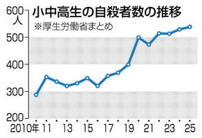 小中高生自殺538人 25年確定値、過去最多 2026年3月28日 05:00 2025年の小中高生の自殺者数の... 残り511文字(全文:528文字) この記事をお読みいただくには「デジタルプラン」または「宅配+デジタルプラン」の会員登録が必要です。無料会員の方はログインしてマイページからコース変更してください。デジタルプランまたは宅配+デジタルプランをご登録中の方はログインしてください。 岐阜新聞デジタル会員に登録すると 無料会員向け記事が読める ニュースレターで最新情報が受け取れる デジタルプラン、宅配+デジタルプランなら Webオリジナルコンテンツが読める 紙面ビューアが読める チケットの先行発売に参加できる お得なクーポンが使える 新規登録ページ ログインページ トップ 岐阜のニュース 小中高生自殺538人 25年確定値、過去最多 関連記事 岐阜市商連が「神田町テラス」設置 歩道で安心して飲食、車道との間にガードパイプ ぎふチャン公式テーマ曲を収録 長澤明日香さんCDミニアルバム発売 4月25、26日の神戸山王まつりをPR 町役場に歴代ポスター展示 高山市でも桜が開花 野球 全国高校女子選抜 佐久長聖が初優勝 ◇バレーボール 大同生命SVリーグ おすすめ記事 【速報】岐阜オープンクラシック 24歳の山田が初優勝 決勝ラウンド 岐阜オープンクラシック【予選ラウンド・ハイライト】 4アンダーで首位3人、1打差に5人続く 鉄道の廃線、岐阜県関係は30年間で10区間93.3キロ 飛騨市古川町、コイも引っ越し新生活 CoIU学生ら作業