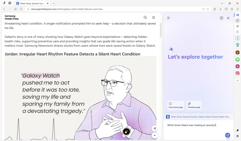 ユーザーは、情報を比較するために複数のタブを次々と切り替える必要がなくなりました。Samsungブラウザは複数のタブにまたがるコンテンツをまとめて比較・要約することができます。これにより、異なる情報源から重要な情報を1つの画面で簡単に把握できるようになります。