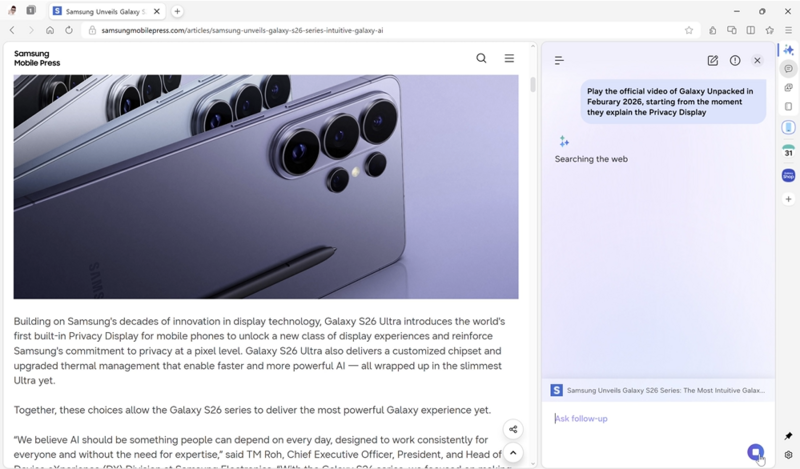 サムスン電子(韓国本社、以下Samsung)は26年3月26日(木)、「Samsung Browser for Windows」の正式リリースを発表いたしました。これにより、スマートフォンやタブレットなどのモバイル端末での閲覧の利便性がパソコンでも展開され、端末間でのシームレスな連携が可能な新しいエージェント型AIにより、検索や閲覧体験をより簡単で直感的にご使用いただけるようになりました。