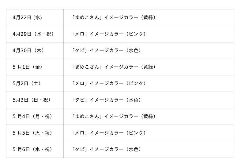 特別イベント開催を記念して、イベント初日となる4月22日(水)およびゴールデンウィーク期間中、「まめきちまめこさん」「メロ」「タビ」をそれぞれイメージしたカラーによる、日替わりライトアップを行います。特別ライトアップ中は、毎時0分に煌びやかな光の演出「スターダスト・フラッシュ」も開催し、名古屋の街を彩ります。【実施日・内容】