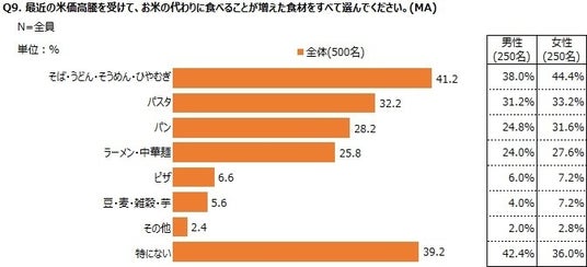 米価高騰を受けて、お米の代わりに食べることが増えた食材としては「そば・うどん・そうめん・ひやむぎ」(41.2%)、