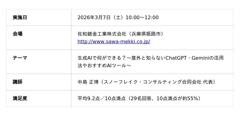 スノーフレイク・コンサルティング合同会社(所在地:愛知県名古屋市、代表:中島正博)は、2026年3月7日、佐和鍍金工業株式会社(所在地:兵庫県姫路市)が年に複数回開催する社内勉強会に講師として招聘され、全社員と一部取引先を対象とした生成AIセミナーを実施しました。セミナーでは生成AIで作ったゲーム・社歌・動画などのデモを交えながら、「明日から使える」具体的な活用法を紹介。終了後のアンケートでは満足度平均が9.2点/10点満点となり、参加者の約7割が9点以上を評価しました。