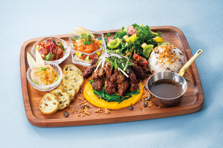 ハワイのローカルフード「ロミロミサーモン」をイメージ。スモークサーモンに、きゅうりやパプリカ、赤玉ねぎなどの彩り豊かな野菜を合わせました。野菜は爽やかなレモンオイルで、サーモンは和風出汁や味噌、生姜でマリネしています。もち麦の食感に、ディルやセルフィーユなどのハーブの香りも加わって、多層的な味わいをお楽しみいただけます。
