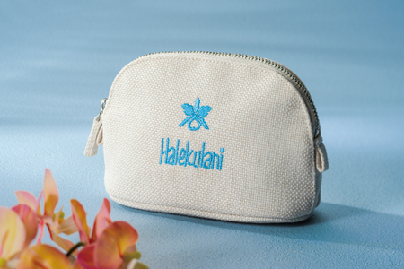 表面にハレクラニロゴマーク、裏面に帝国ホテルロゴマークをあしらった、オリジナルポーチです。リネンのような手触りでハワイらしさをイメージし、内側はハレクラニブルーの布地で仕立てました。