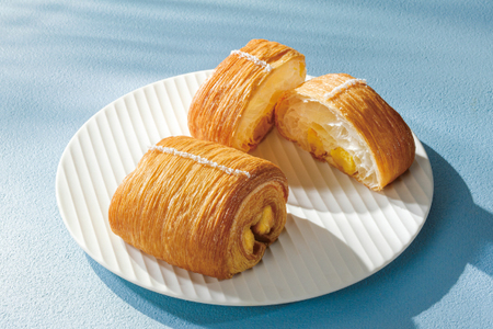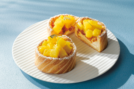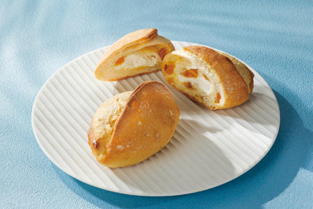 ハレクラニベーカリーで人気のパンを、小さめにリサイズして食べやすくしました。マンゴーのパート・ド・フリュイをあわせたフランスパン生地に、クリームチーズを入れて焼き上げた、朝食におすすめのパンです。