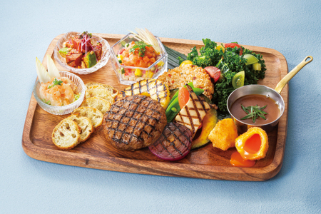 牛リブロースには、生クリームと焦がしバターでコクを出したかぼちゃのピューレを敷き、ブイヨンを染み込ませたほうれん草を添えました。仕上げに水菜や赤玉ねぎ、パンプキンシードを散らして、重厚な旨味の中に食感のアクセントを加えています。さらに、十穀米やケールサラダ、「ポケ トリオ」を贅沢に盛り込みました。手間と時間をかけた牛リブロースの深い味わいと、彩り豊かな付け合わせや前菜との調和をお楽しみいただけます。